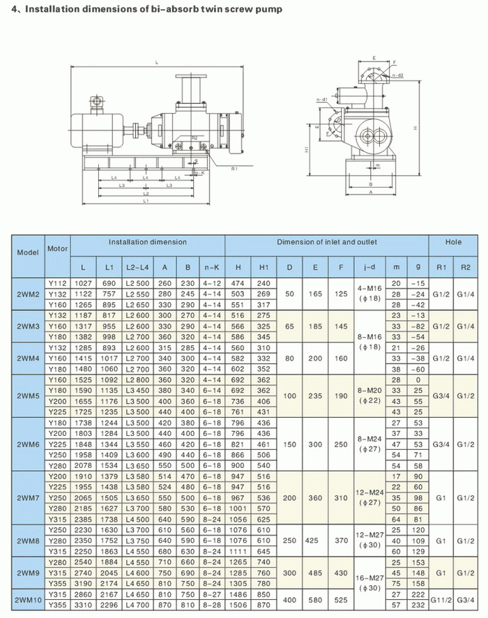 • أبعاد تركيب ثنائية يمتص مضخة المسمار التوأم